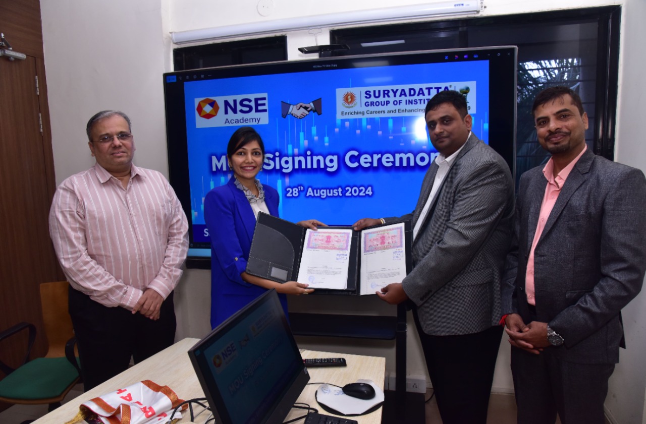 Suryadatta Group of Institutes is excited to announce its collaboration with the National Stock Exchange (NSE) in Mumbai through the signing of a Memorandum of Understanding (MOU). This strategic partnership aims to enhance the educational experience for students interested in the field of financial markets.