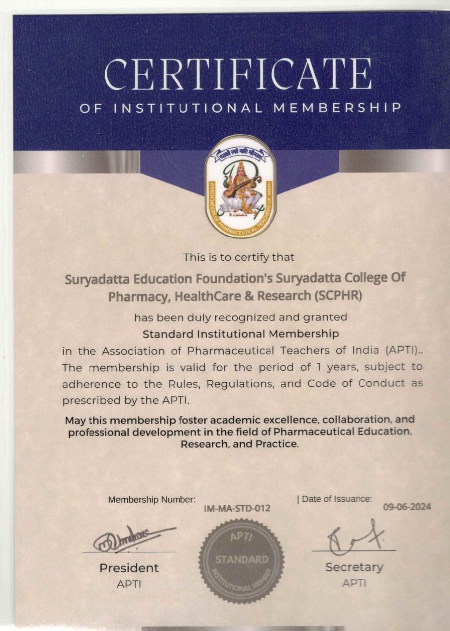 Suryadatta College of Pharmacy Healthcare and Research (SCPHR) has been officially inducted as a member of the prestigious Association of Pharmaceutical Teachers of India (APTI). This esteemed membership marks a significant milestone in our journey toward excellence in pharmaceutical education and research.