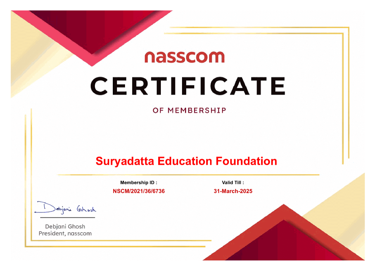 Suryadatta has partnered with NASSCOM for the Future Skills Initiative that focuses on emerging technologies of the future and the expected skill sets for the future work which is a truly industry driven ecosystem based on indepth research on skilling and reskilling requirements. Students from Suryadatta shall be privileged to leverage digital disruption by equipping themselves with 155+skills spanning 70+ job roles on top 10 emerging technologies and thus will have the potential for career growth in the industry. The online learning portal of NASSCOM shall enable discovery, continuous learning and deep skilling of the students with content from the best global providers.